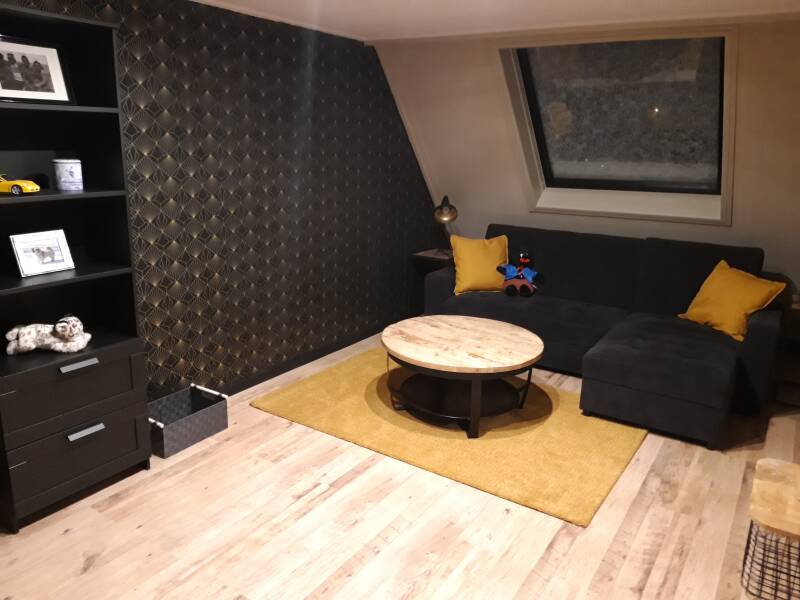 Zolder: muren behangen en ramen geschilderd en laminaat vloer gelegd.