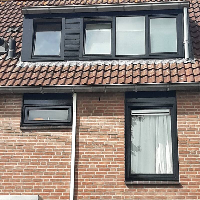 Dakkapel voor en achter, badkamerraam en slaapkamerraam geschilderd in de kleur 9005 met Sigma Allure Gloss